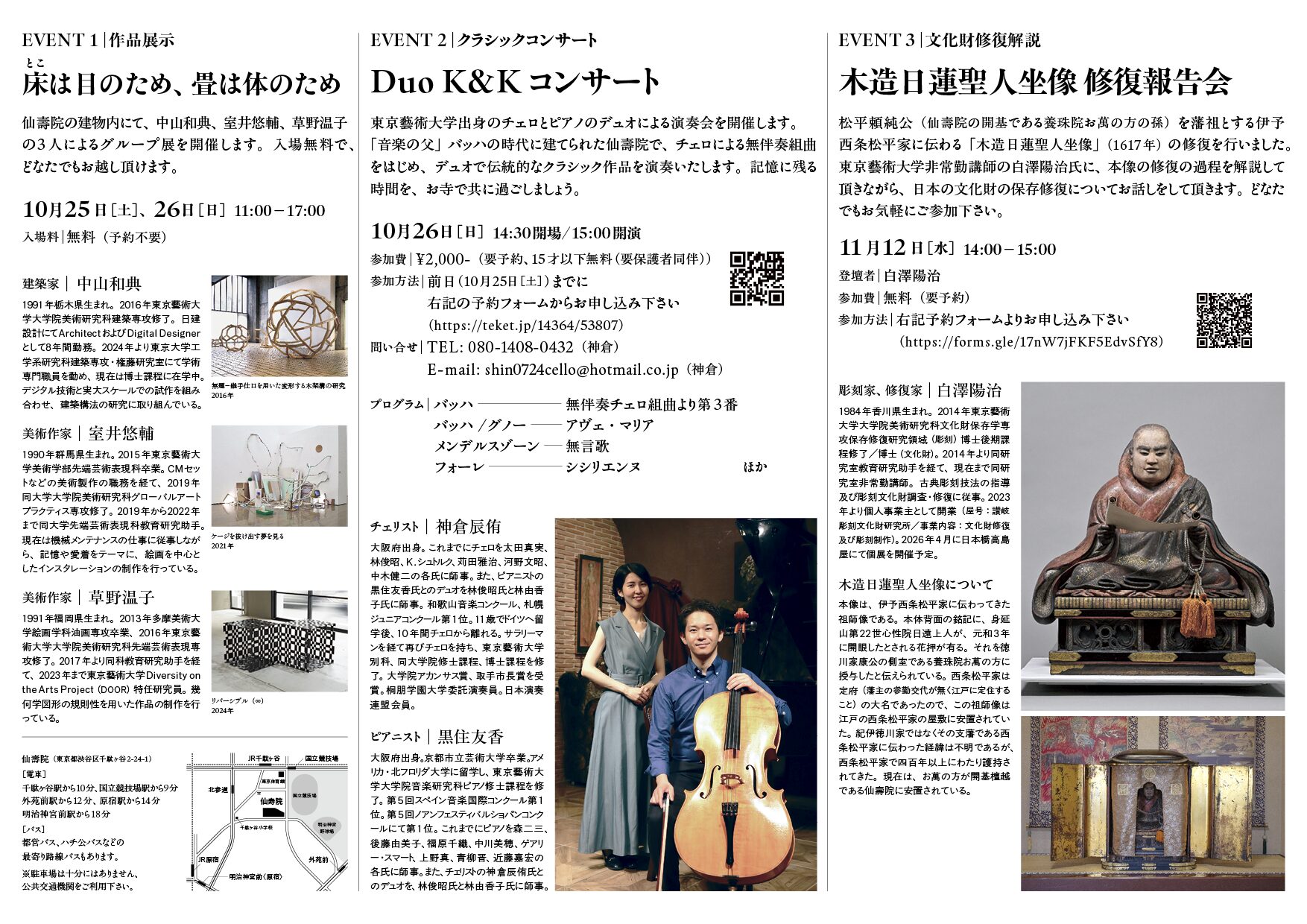 A small exhibition of works by Kazunori Nakayama, Yusuke Muroi, and Atsuko Kusano will be held in the alcove of Senjuin Temple.
